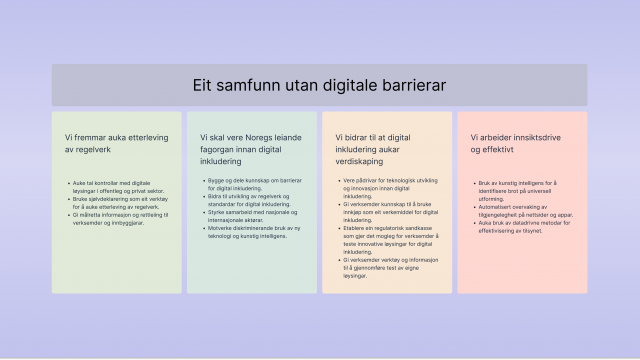 Strategien består av fire strategiske mål. Desse måla styrer både vår daglege drift og den langsiktige utviklinga av verksemda. Strategien gjeld så lenge føresetnadene ho byggjer på er gyldige, og vil vere førande for våre prioriteringar og retningsval.